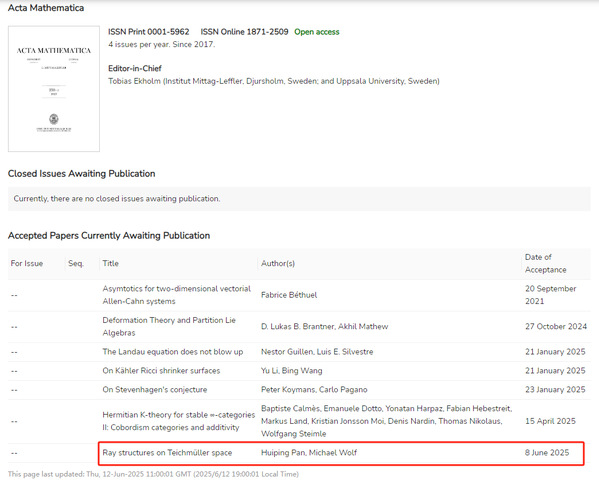 据悉,Acta Mathematica是国际数学界公认的四大顶尖期刊之一,与Journal of the AmericanMathematical Society(《美国数学会杂志》)、Inventiones Mathematicae(《数学新进展》)和Annals of Mathematics(《数学年刊》)齐名。该期刊以其严格的审稿标准和极高的学术影响力著称,近年来每年发文仅10篇左右,长期以来是全球数学家发表重大理论成果的重要平台。新中国成立以来,中国大陆学者在该期刊发文10余篇。