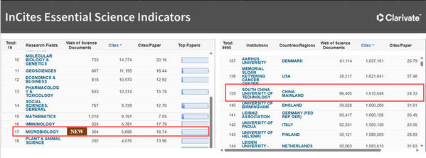 9月11日,科睿唯安(Clarivate Analytics)基本科学指标数据库(Essential Science Indicators,简称ESI)发布最新数据显示,华南理工大学微生物学首次进入ESI世界排名前1%。至此,学校ESI全球前1%学科数增至18个,其中前1‰学科5个,前1‱学科2个(前1‱学科数并列全国第四)。目前,学校全球总体排名位列第139位,较2024年同期提升29位。
