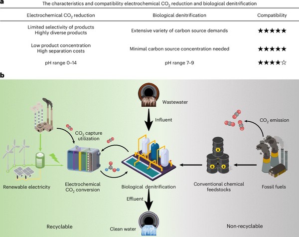 二氧化碳资源化利用被视为实现碳中和的重要途径,但一个长期难题是:如何在不经过复杂分离和纯化的情况下,直接利用电化学还原产物。与此同时,城市污水处理中反硝化过程需要外加碳源,而现有的商业碳源(如醋酸盐)成本高昂且存在应用局限。基于此,陈光需教授和邱光磊教授团队深度结合学科特色和实验平台,通过仔细对比CO2RR与城市污水反硝化处理两个系统的特点,提出了一种新型的电化学-生物耦合体系,将二氧化碳电还原与城市污水反硝化过程相结合。