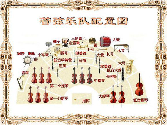 打击乐组有定音鼓、小军鼓、大鼓、三角铁、钹、锣等;色彩乐器组包括钢琴、竖琴、排钟、管风琴等。