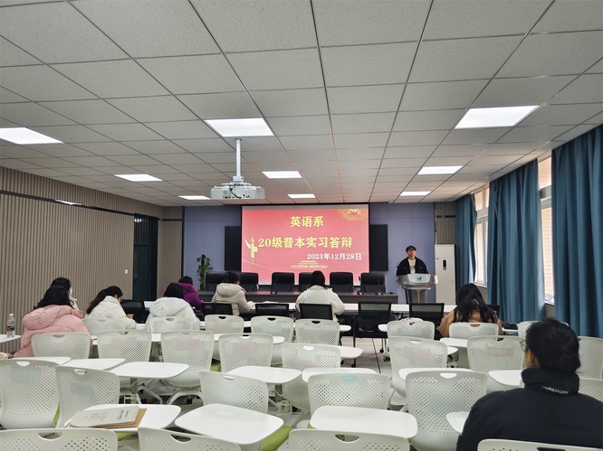 外国语学院英语专业为检验学生自主实习的成果,2023年12月28日下午,于外语楼301举行了自主实习答辩。答辩从下午14点开始,历时近4小时。外国语学院英语系副主任黄静、大学英语教学部副部长杜璇、英语系教师许敏担任答辩评委,谷蕾等17名实习生参加了此次答辩。