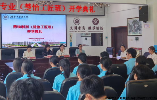 2025年9月19日上午,湖南中医药大学与湖南中医药高等专科学校联合开办2025级药物制剂专业(楚怡工匠计划)开学典礼在湖南中医药大学闻道楼4楼会议室隆重举行。湖南中医药大学药学院党委书记张熙、副书记方圆、副院长彭彩云、学生科科长丑天舒、湖南中医药高等专科学校药学院党总支副书记袁媛、药物制剂教研室主任唐婷以及全体学生参加开学典礼。
