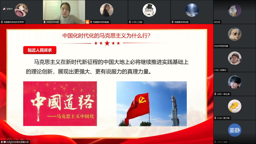 为加深我院学生党员对马克思主义中国化时代化知识的理解,强化党的二十大理论学习,在以学铸魂中筑牢信仰之本、补足精神之钙、把稳思想之舵,进一步提升自身服务能力。12月14日19:30,我院学生党支部开展了“不断推进马克思主义中国化时代化”线上主题党课。此次党课全部学生党员参与,由我院学生党员何诗晋讲授党课,2022级历史学3班钟毓嘉担任主持人。