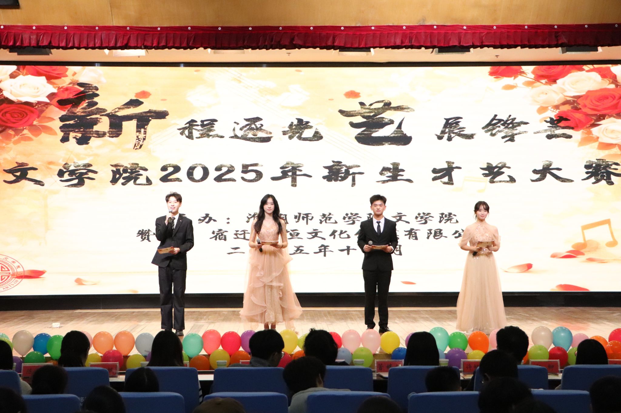 华灯初上夜,星光熠熠映礼堂;青春正当时,梦想扬帆启新程。11月16日晚,文学院在图书馆报告厅举行“新”程逐光,“艺”展锋芒——2025年新生才艺大赛。院党委副书记管婷婷,院团委书记许帆扬,25级新生班主任代表赵曜曜、周文波、杨柳莅临现场并担任评委。各兄弟学院学生代表,文学院团委、学生会、自管会主要负责人出席本次活动。文学院25级全体新生观看比赛。活动由宿迁恒恒文化传媒有限公司赞助。