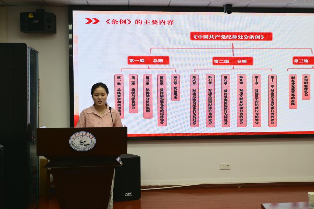 “加强纪律性,革命无不胜”。纪律严明是党的光荣传统和独特优势,正是靠着严明的纪律和规矩,中国共产党才能不断取得革命、建设和改革事业的伟大胜利。在集体学习中,支部宣传委员杨培妍以“学党纪,强党性”为题讲授党课,解读《中国共产党纪律处分条例》(下文简称《条例》),从适用范围、历次修订情况、主要内容等展开,系统介绍《条例》的整体概况,为支部成员会后自学奠定了基础。随后,杨培妍就《条例》内容逐章解读,号召支部党员坚持提高站位学、逐章逐条学、带着使命学、联系实际学。在学习现场,支部成员认真听讲,细致批注,深化对《条例》的理解和掌握。