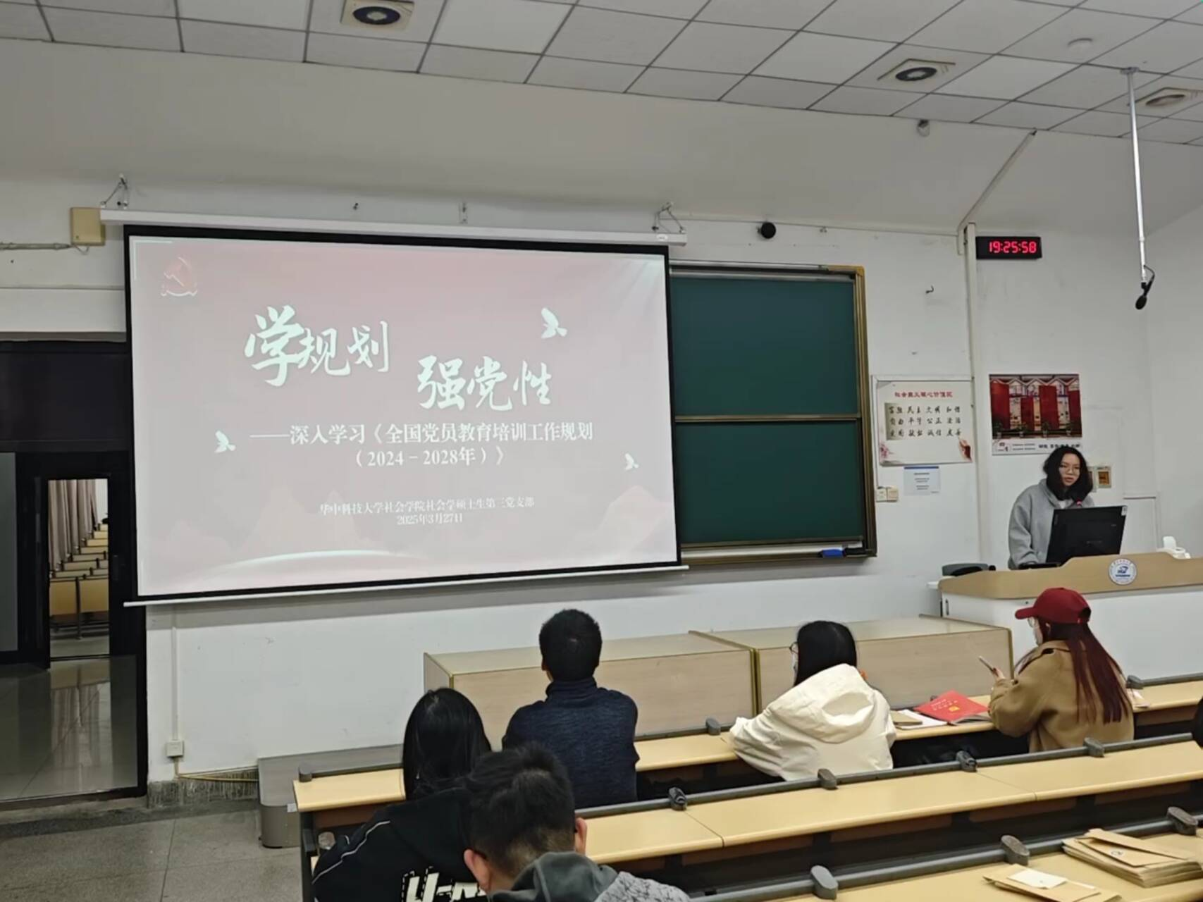 社会学院社会学硕士生第三党支部的叶传凤同志对《全国党员教育培训工作规划(2024-2028年)》进行了领学。他从规划的背景与意义讲起,深入解读了主要内容和目标要求。通过此次领学,与会同志对《规划》有了更清晰的认识,为今后的理论学习明确了方向,进一步提升党员的思想政治素质。