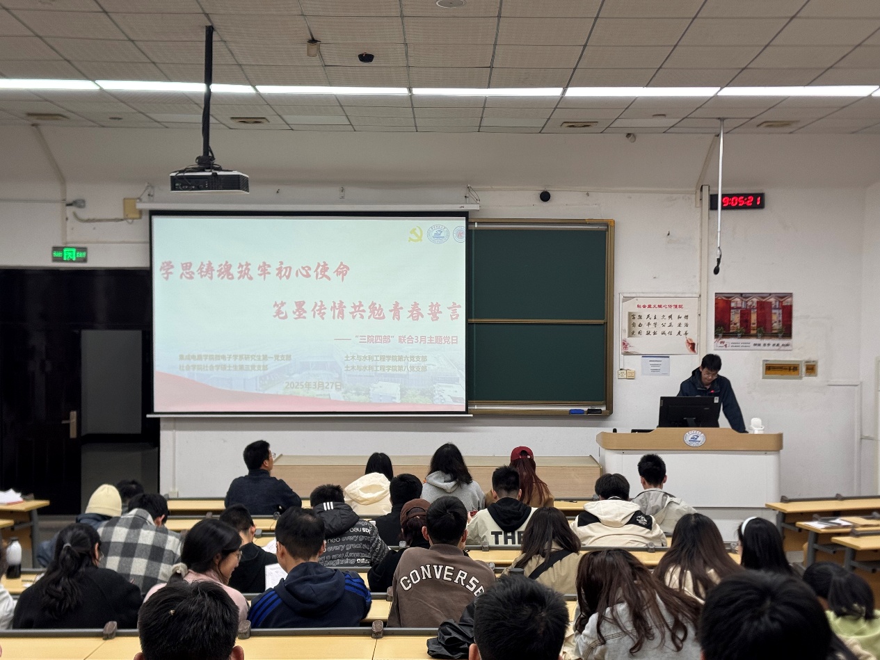为深入学习领会全国两会精神、习近平总书记重要指示精神,贯彻落实《全国党员教育培训工作规划(2024 - 2028 年)》,弘扬新时代雷锋精神,3月27日晚,集成电路学院微电子学系研究生第一党支部联合社会学院社会学硕士生第三党支部、土木与水利工程学院研究生第六党支部以及土木与水利工程学院研究生第八党支部,在西五楼119开展了“学思铸魂筑牢初心使命,笔墨传情共勉青春誓言”主题党日活动,微电子学系研究生第一党支部程放同志主持会议。