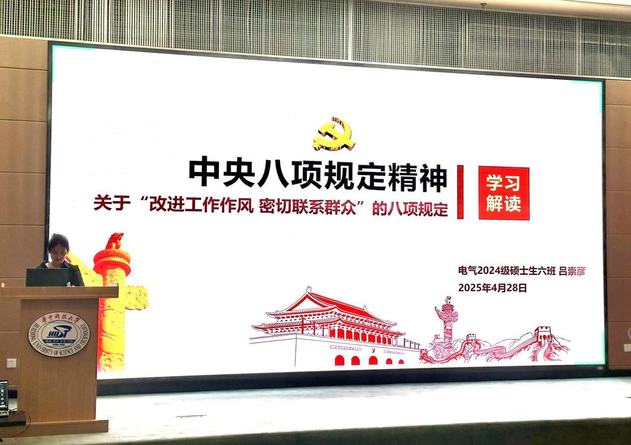 空中课堂结束后,各支部成员共同进行了本月的党课学习。首先,电气与电子工程学院2024级硕士生六班党支部的吕崇彦带领大家学习了中央八项规定精神,并对《习近平关于加强党的作风建设论述摘编》进行了详细解读,号召同学们重视这次专题学习的意义,做到锲而不舍贯彻中央八项规定,推动党的作风持续向好,推动党中央各项决策部署落到实处,为推进中国式现代化贡献智慧和力量。