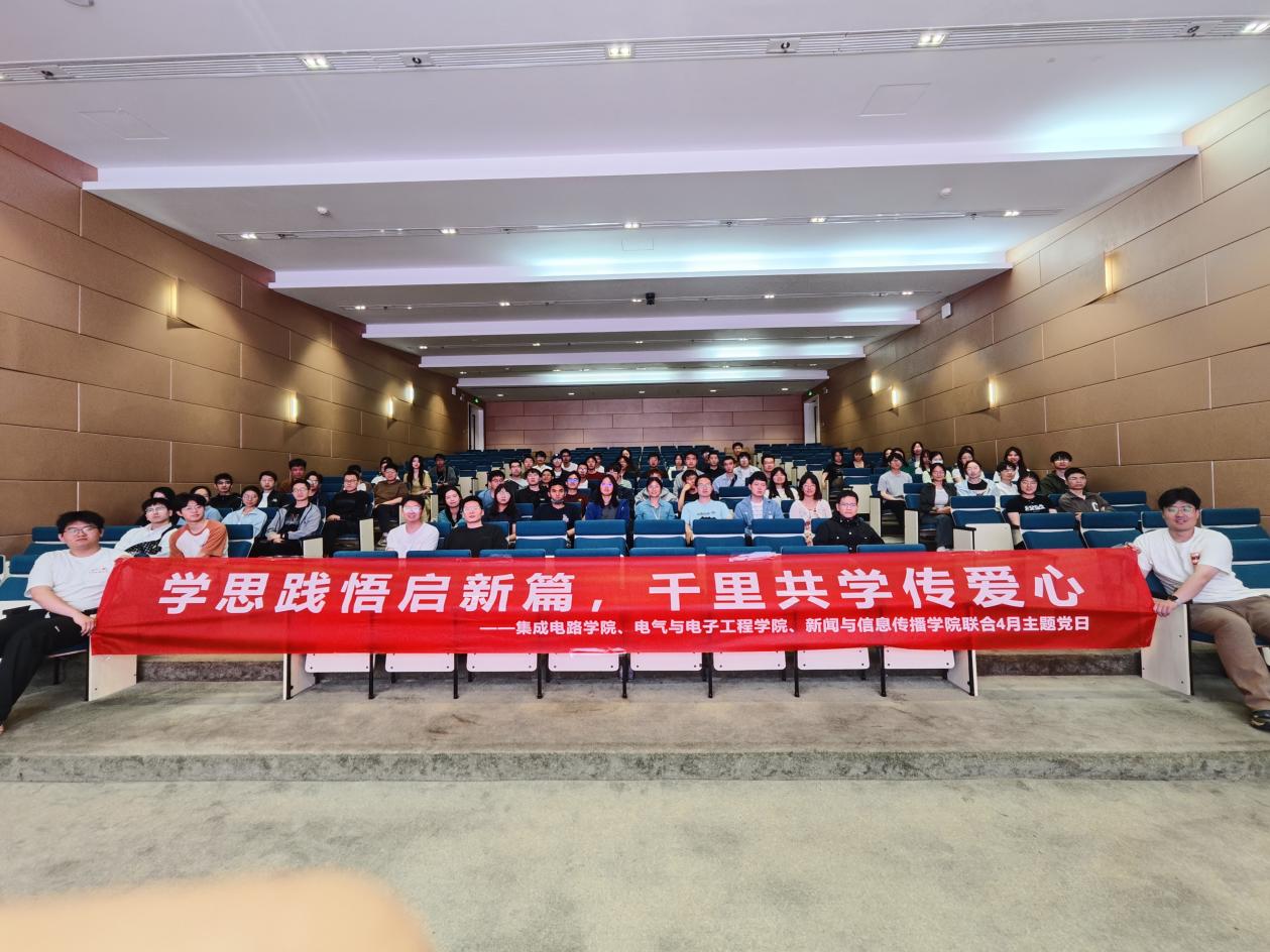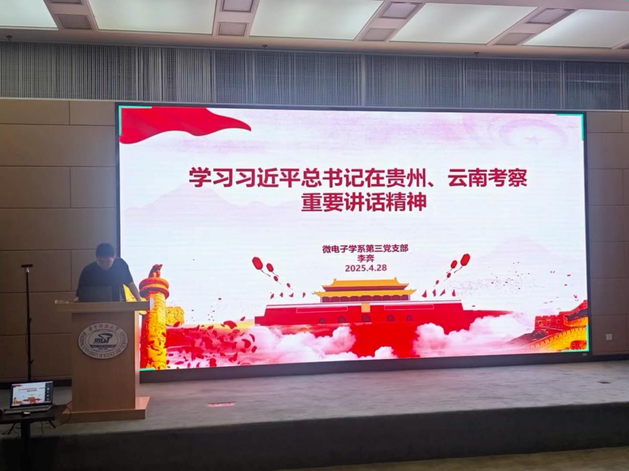 为深入贯彻中央八项规定精神、全民国家安全宣传教育等专题学习,同时向广西乐业县高级中学的同学们开展科普课堂,集成电路学院微电子学系研究生第一党支部携手新闻与信息传播学院广告与媒介经济专业硕士生党支部、新闻学专业硕士生党支部与第三党支部以及电气与电子工程学院2024级硕士生六班党支部,与华中科技大学研究生支教团广西乐业分队于4月28日在光电大楼C117联合举行了“学思践悟启新篇,千里共学传爱心”主题党日活动。本次活动由集成电路学院微电子学系研究生第一党支部的张恒峰主持,乐业县高级中学师生线上参与“空中课堂”环节,实现跨地域党建共建与爱心传递。