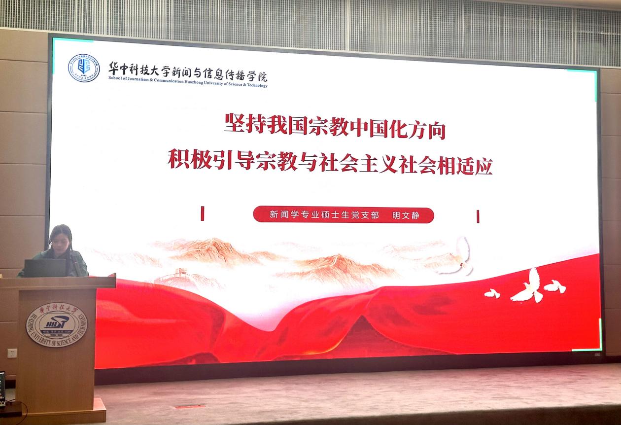接着,新闻与信息传播学院新闻学专业硕士生党支部的明文静带领大家学习了习近平总书记在全国宗教工作会议上的重要讲话。她详细介绍了党的宗教工作基本方针、我国涉宗教相关法律法规等内容,强调只有“坚持我国宗教中国化方向,积极引导宗教与社会主义社会相适应”,才能更好德组织和引导信教群众同广大人民群众一道为全面建成社会主义现代化强国、实现中华民族伟大复兴的中国梦而团结奋斗。