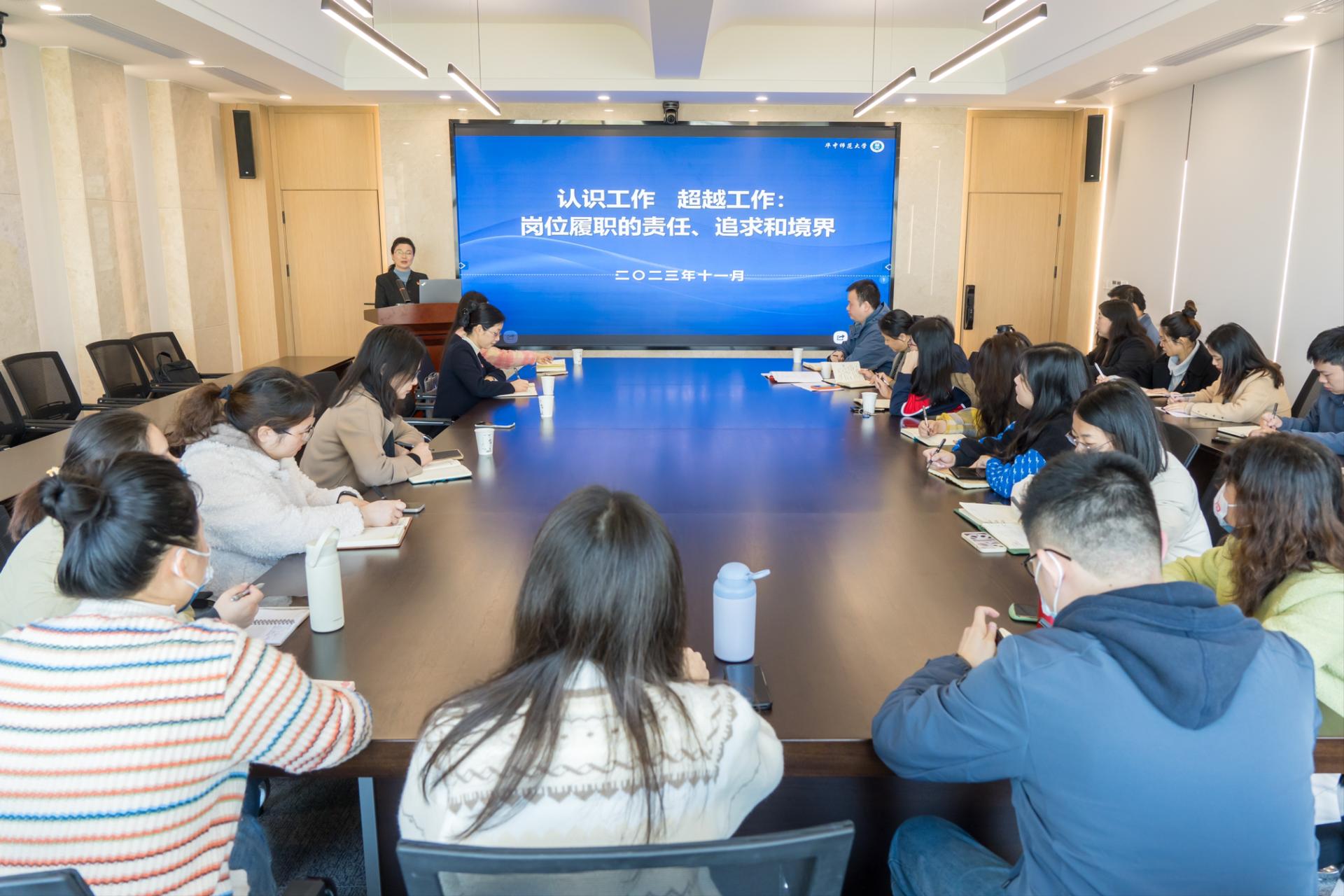 为引导广大党员教师始终保持统一的思想、坚定的意志、协调的行动、强大的战斗力,强化党员教师队伍服务意识,践行服务育人理念,11月16日上午,教育学院教工第四党支部(行政教师党支部)邀请院党委书记陈雪玲以“认识工作 超越工作:岗位履职的责任、追求与境界”为题讲授专题党课。院党委副书记苏春艳、王璐,教工第四党支部全体党员以及学院行政教辅人员参会交流,会议由教育学院教工第四党支部书记谭颖芳主持。