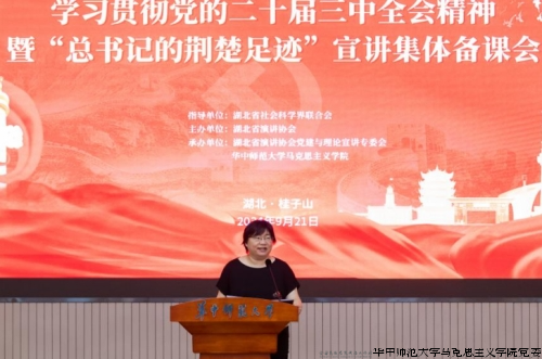9月21日,学习贯彻党的二十届三中全会精神暨“总书记的荆楚足迹”宣讲集体备课会在华中师范大学科学会堂一楼报告厅举行。湖北省演讲协会党支部书记、会长陈飞,湖北省演讲协会副会长、汉阳区政协委员曹辉,湖北省演讲协会副会长、武汉市公安局经开分局党委委员、政治处主任陈晓波,湖北省演讲协会副会长、江汉大学马克思主义学院党委书记吕洪雁,湖北省演讲协会秘书长、湖北广播电视台新闻评论员尹华正,湖北省演讲协会理事、新洲区教育局宣传培训科负责人彭江帆,湖北省演讲协会理事、中建三局演讲协会秘书长胡洁,湖北省演讲协会副秘书长蒋渝,华中师范大学马克思主义学院党委书记、湖北省演讲协会党建与理论宣讲专委会主任孙永祥,华中师范大学马克思主义学院理论宣传与社会服务部长、湖北省演讲协会党建与理论宣讲专委会副主任兼秘书长徐秉国等参加会议。华中师范大学马克思主义学院党委副书记、纪委书记,湖北省演讲协会党建与理论宣讲专委会副主任邵莉莉主持会议。