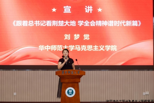 示范宣讲后,会议进入集体备课研讨的第二阶段。华中师范大学马克思主义学院副教授、湖北省五一劳动奖章获得者刘梦觉作了《跟着总书记看荆楚大地,学全会精神谱时代新篇》的主题宣讲。她用“科技创新”“高质量发展”“人民就是江山”三个关键词讲述了总书记在湖北考察时体现和强调的重要治国理念。
