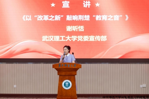 武汉理工大学党委宣传部青年干部、“青春湖北”公众号“青听”栏目特约主播谢昕恬进行了主题为《以“改革之新”敲响荆楚“教育之音”》的宣讲,她强调总书记的五次考察对于湖北的改革发展和现代化建设的重要意义,号召高校青年教师要坚决做好高校意识形态阵地的守护者,积极做好湖北改革实践成果的宣讲者,坚定做好社会主义核心价值观的传承者。
