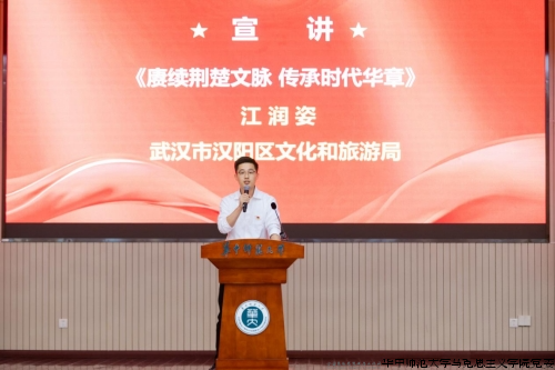 武汉市汉阳区文化和旅游局文旅科副科长江润姿以《赓续荆楚文脉 传承时代华章》为主题进行宣讲,他从党的二十届三中全会提出的“聚焦建设社会主义文化强国”出发,指出荆楚文化的传承与创新对于中国式现代化建设的积极影响,强调青年是培育和创造属于新时代的新文化的主力军。