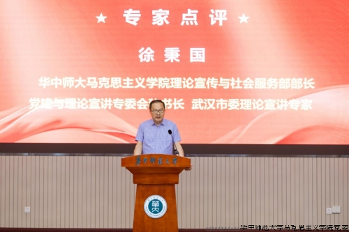 集体宣讲结束,华中师范大学马克思主义学院理论宣传与社会服务部部长、湖北省演讲协会党建与理论宣讲专委会副主任兼秘书长徐秉国对本次主题宣讲进行了点评。他用“宣”“讲”“微”三个字分别概括本次主题宣讲所体现的政治性、哲理性和多样性,对五位宣讲者给予了充分肯定,并表示理论宣讲应当紧密联系人民群众,让党的理论“飞入寻常百姓家”。