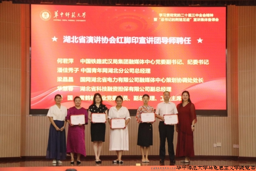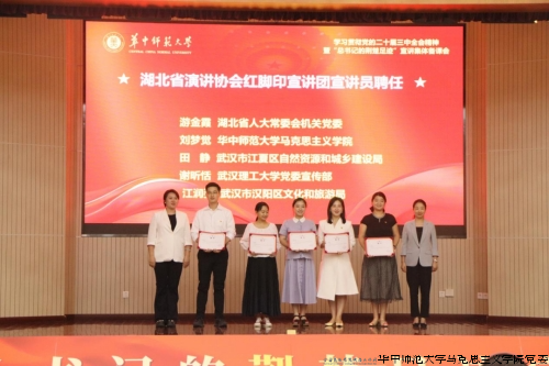 随后,会议进入第三阶段。湖北省演讲协会理事、新洲区教育局宣传培训科负责人彭江帆和湖北省演讲协会理事、中建三局演讲协会秘书长胡洁为湖北省演讲协会红脚印宣讲团宣讲员游金霞、刘梦觉、田静、谢昕恬、江润姿颁发聘书。湖北省演讲协会副会长、武汉市公安局经开分局党委委员、政治处主任陈晓波和湖北省演讲协会副会长、江汉大学马克思主义学院党委书记吕洪雁为湖北省演讲协会红脚印宣讲团第三批导师何君萍、潘佳秀子、梁晶晶、华慧春、魏国颁发聘书。最后,全体参会人员在科学会堂门口进行合影留念,本次学习贯彻党的二十届三中全会精神暨“总书记的荆楚足迹”宣讲集体备课会圆满结束。