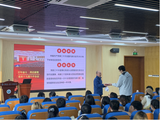 最后,马书记以提问的方式对参会的党员同志进行互动并赠书,马新华书记强调道:“我们要继续深入学习党的十九届六中全会精神,学院及全体师生要加大学习宣传力度,,深刻领悟全会精神,切实把思想和行动统一到全会精神要求上来,要有坚定不移地把“两个确立”真正转化为做到“两个维护”的思想自觉、政治自觉、行动自觉,要长期坚持党的“十个坚持”,努力不懈地推进学院各项事业的长足发展。”