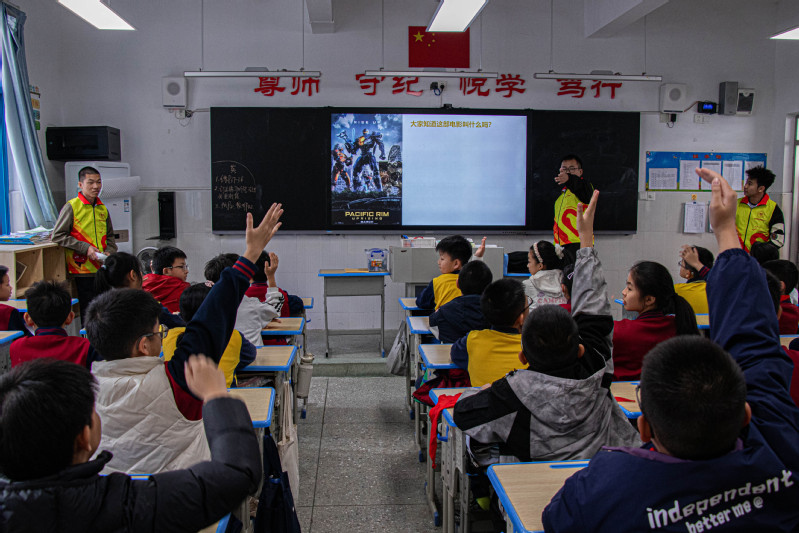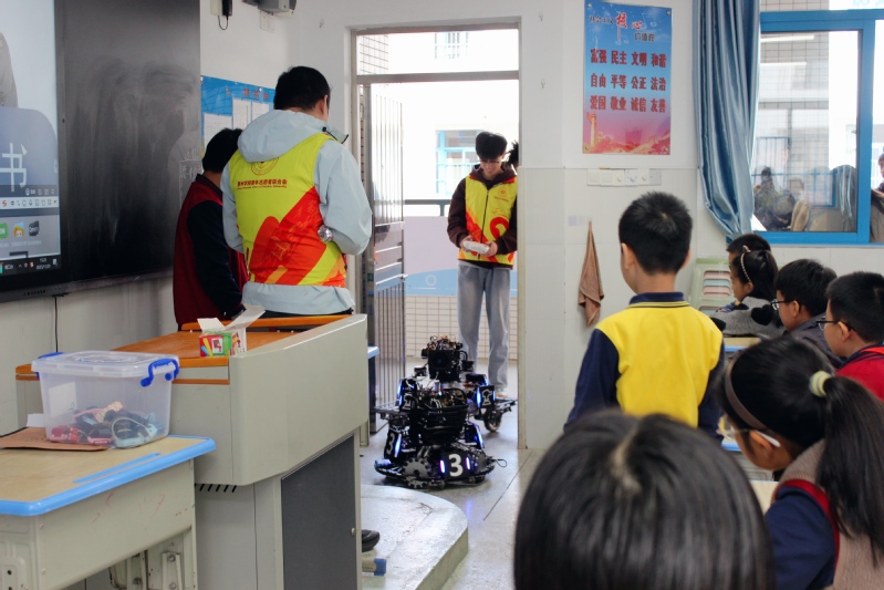本次义教活动主要在五年级3个班级开展。活动中,将物理科普融入机甲、科学实验以及“两弹一星”精神宣讲三大板块展开,为小学生们带来了一场集科技性、趣味性与教育性于一体的科普体验。在机甲机器人展示课堂,学院机甲实验室的志愿者们以电影《环太平洋》为引,将自研机器人带进教室。随着操作员远程操控,机器人在讲台上灵活移动、精准完成“射击”动作,引发孩子们阵阵惊叹。现场气氛热烈,科技的震撼力与工程魅力深深烙印在每位孩子心中。