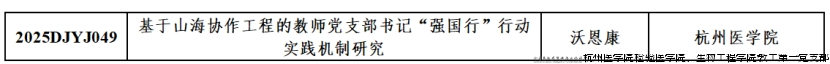 近日,浙江省普通高校党建研究专业委员会发布关于2025 年党建研究专项课题立项的通知,我院教工第一党支部副书记沃恩康老师申报的“基于山海协作工程的教师党支部书记“强国行”行动实践机制研究”成功入选获批立项。