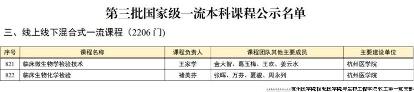 近日,教育部正式公布了第三批国家级一流本科课程认定结果,检验医学院、生物工程学院申报的2门线上线下混合式课程成功入选,分别是褚美芬教授主持的《临床生物化学检验》与王家学副教授主持的《临床微生物学检验技术》。这是学院继《临床分子生物学检验技术》入选国一流课程后,在课程建设领域取得的又一重大突破,标志着学院国家级一流课程群建设迈上了新台阶。