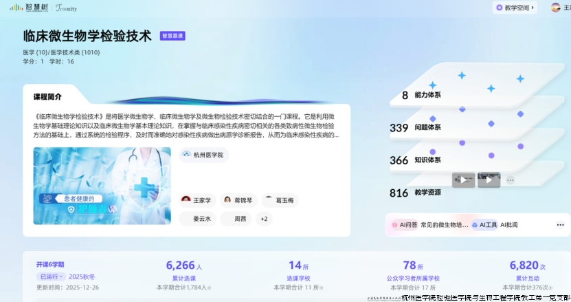《临床微生物学检验技术》课程秉持“以学生成长为中心” 的教学理念,历经多年系统化、阶梯式建设,已逐步发展成为一门资源体系完整、辐射广泛、教学互动活跃的优质课程。课程自2016年由王家学老师牵头启动建设以来,持续推动教学创新与资源迭代,逐步实现从SPOC平台(2019)、省级线上一流课程(2020)、省级课程思政示范课程(2022)到MOOC与知识图谱双平台上线(2023)的跨越,并于2025年成功获评为线上线下混合式国家级一流本科课程。课程依托智慧教学平台已平稳运行6个教学周期,累计选课6,266人,覆盖全国78所高校,互动量达6,820次。课程紧密对接“新医科”建设要求,以成果导向教育(OBE)理念,构建了涵盖8大能力维度、339个问题单元、366个知识节点与816项教学资源的立体化课程体系。通过融合临床案例、知识图谱与虚拟仿真项目等数字化资源,开展以真实情境为导向的翻转课堂与探究式学习。课程已累计建设了微视频近300分钟,建成了课程思政案例,并开展了多轮线上线下混合式教学,教学成效获得校内外师生与行业专家的广泛认可。展望未来,课程将继续深化教学实践,积极探索智慧课程升级、人工智能交叉课程建设、虚拟仿真资源拓展等创新路径,持续推动课程内涵发展,助力培养具有扎实专业能力、临床思维与人文素养的新时代高素质应用型医学检验人才。