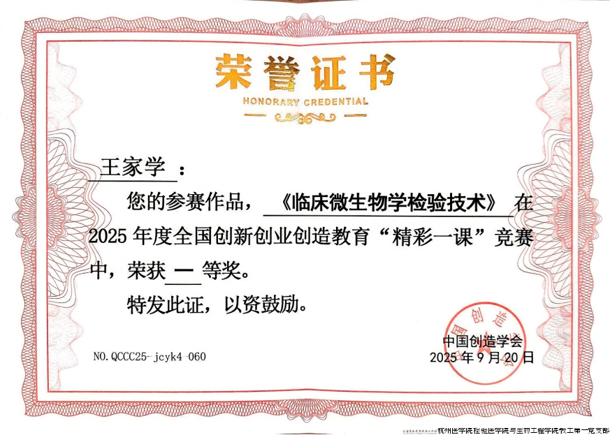 教学授课技能竞赛(卫生微生物检验组)一等奖