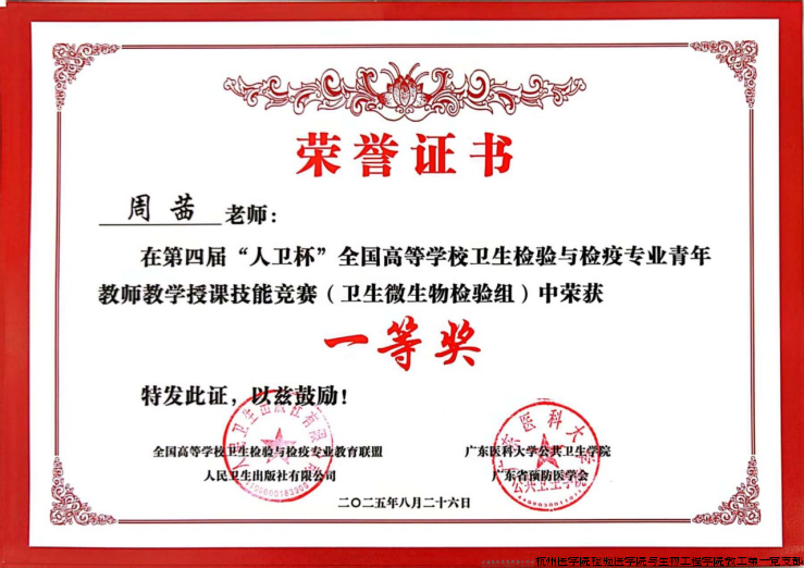 周茜老师获第四届“人卫杯”全国高等学校卫生检验与检疫专业青年教师