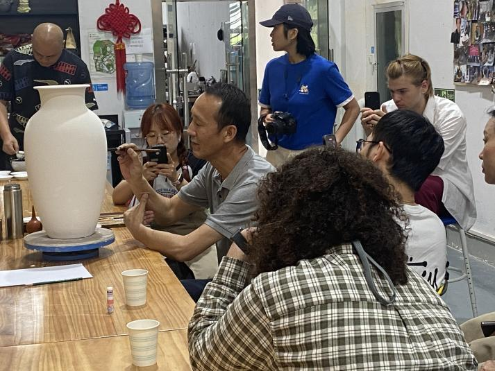7月3日,美术学院教师第二党支部成员赵中良教授受邀为创作营授课。赵中良为国际友人讲述了青花绘画的艺术特点、发展历程,现场展示了陶瓷釉下、釉中青花的技艺,并就青花艺术与创作营的成员们进行了交流。