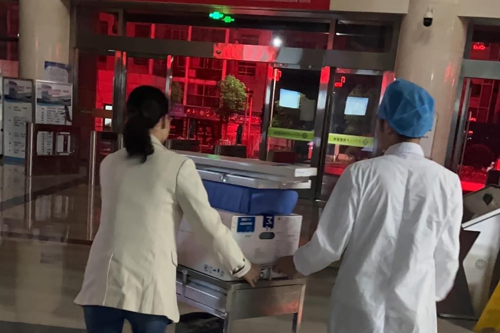 经过严谨的评估、检查、设备调配,顺利将连接着ECMO机器的病人转运到救护车上,装载着病人和各种救命仪器设备的救护车从泰和县人民医院出发回吉安。转运途中,医护人员密切观察ECMO运转及患者病情变化,随时调整仪器参数,全力保障患者转运途中的安全。科护士长方全凤在新院区协调做好入科转运准备,包括转运通道、床位、医护人员及药物等一切准备就绪,并安排相关人员到住院大楼门口等候。