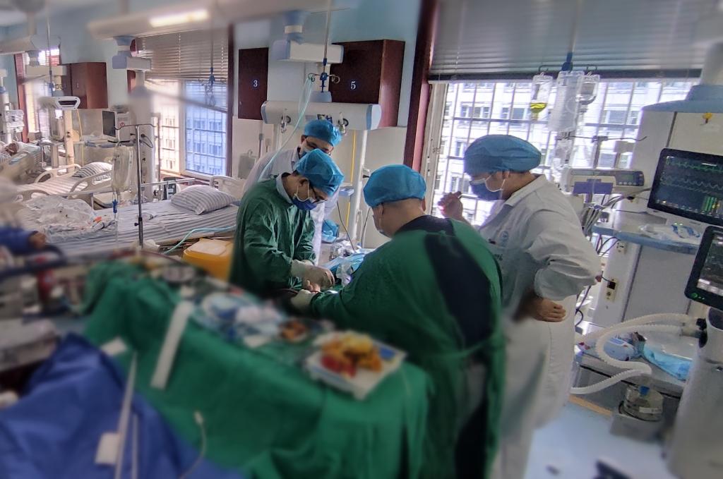 团队到达后立即了解病情,经行纤支镜吸痰后血氧仍未改善,经讨论,应用ECMO治疗是唯一可能挽救患者生命的救治措施。经与患者家属沟通同意行ECMO治疗,团队迅速实施ECMO操作。