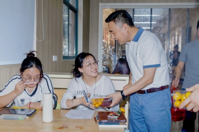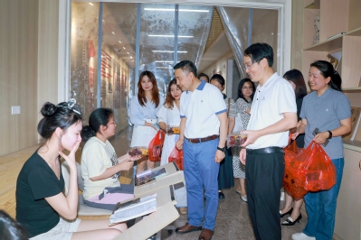 座谈会后,董晓晨部长一行参观了鹿田书院“一站式”学生社区党建特色区域(师学先锋长廊、党史校史文化墙),深入考察功能房、学习长廊等公共空间的运行管理和使用情况。在“耕读书吧”“一品书吧”等学生期末集中复习区域,董晓晨部长为同学们送上新鲜的时令水果,亲切地与学生交流,仔细询问大家的期末学习安排、生活状况、心理状态,认真倾听学生在学习生活中遇到的实际困难。一句句温暖的问候、一声声贴心的鼓励,让紧张备考的学生们倍感温暖,有效缓解了他们的考试压力,为期末复习营造了温馨和谐的氛围。