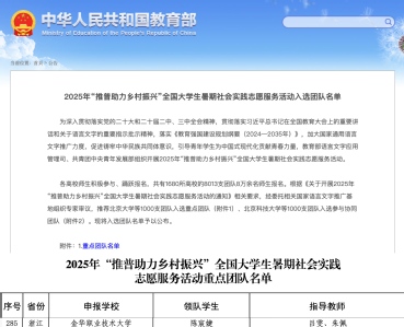 近日,教育部公布2025年“推普助力乡村振兴”全国大学生暑期社会实践志愿服务活动入选团队名单。我院“绿荫·推普”社会实践队入选2025年“推普助力乡村振兴”全国大学生暑期社会实践志愿服务活动“重点团队”。