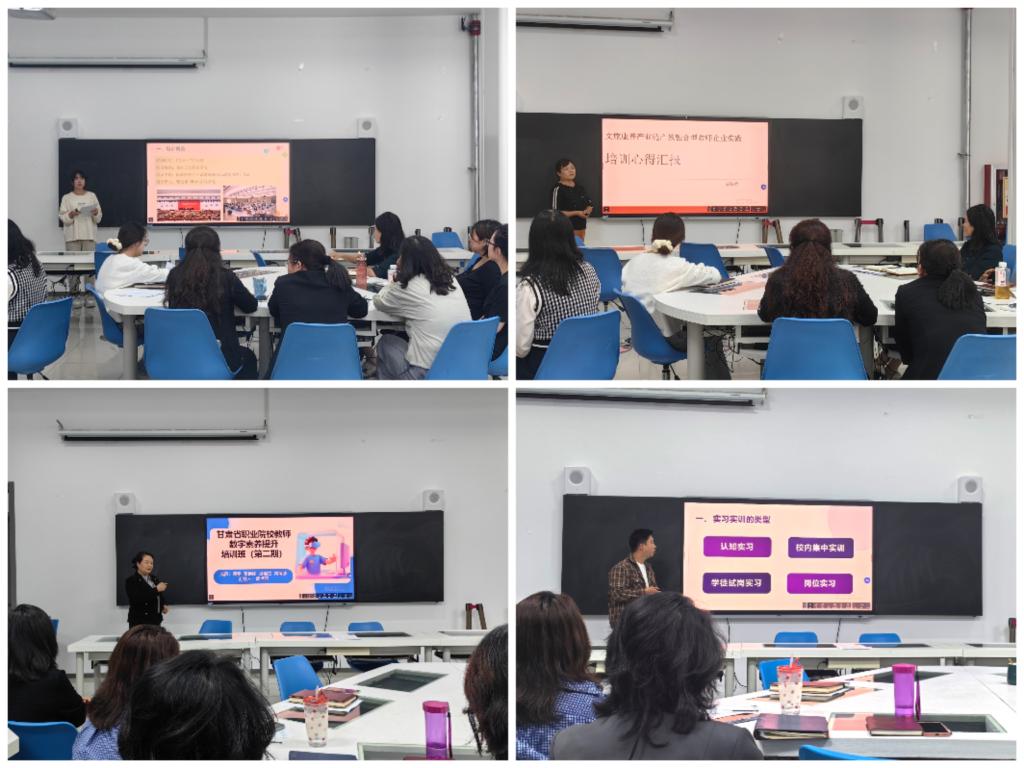 会上,赵筱晗、张婷、黄艳丽、曹彤4位教师围绕培训中的核心内容,结合自身教学与科研实际,从不同维度进行了深入交流。赵筱晗老师聚焦康养产业最新政策导向与发展趋势,解读了行业人才培养的新要求;张婷老师分享了课程思政建设、线上线下混合式教学等方面的创新方法与实践案例;黄艳丽老师从生成式人工智能引领教育高质量发展出发,分享了人智协同混合式教学模式的设计;曹彤老师针对实训教学改革、产教融合协同育人等议题,提出了具有针对性的思考与建议。分享过程中,老师们通过PPT展示、视频片段等形式,将培训所学的精华内容直观呈现,引发了在场教师的广泛共鸣与热烈讨论。
