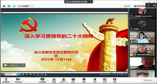为切实做到先学一步、学深一层,全面准确把握党的二十大精神,2022年12月14日中午12点,财经学院党总支会计金融党支部组织全体教师党员通过腾讯会议收看了由中共吉林市委党校常华荣教授主讲的学习党的二十大《党章(修正案)》解读视频。此次活动由支部组织委员邢建华老师主持,全体支部党员参加。