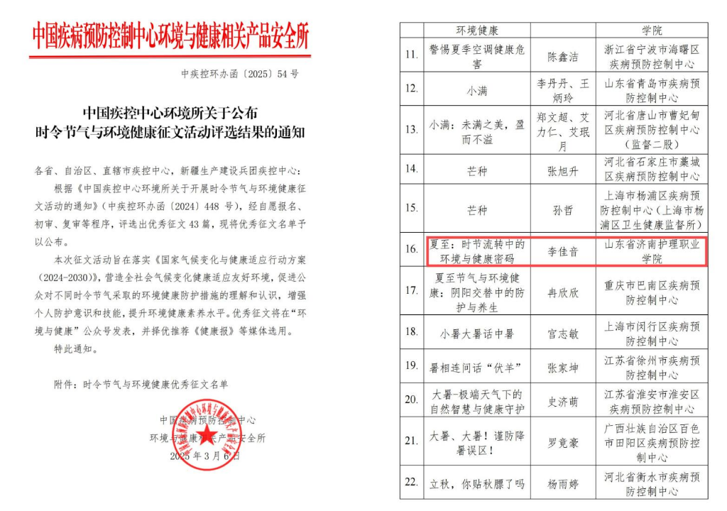 近日,中国疾病预防控制中心环境与健康相关产品安全所(以下简称“中国疾控中心环境所”)公布了“时令节气与环境健康”主题征文活动评选结果。我校护理系学生积极参与并斩获佳绩,获优秀征文,展现了我校学子在环境健康领域的人文关怀与科学素养。