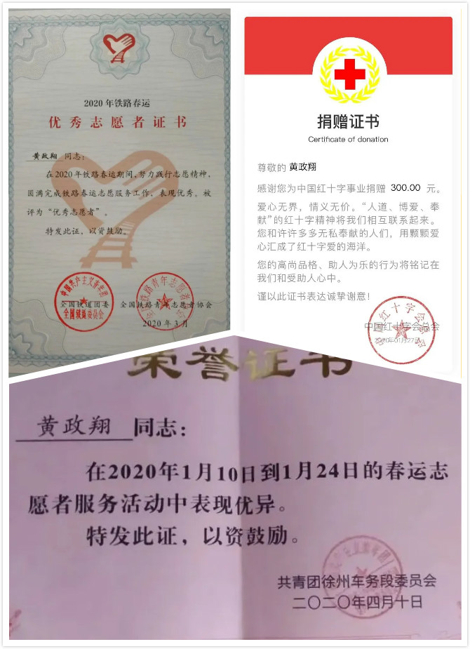 黄政翔在2020年铁路春运志愿服务活动中因为表现突出,获得全国铁道团委和全国铁道青年志愿者协会“优秀志愿者”称号,同时获得连云港火车站徐州车务段授予的“先进个人”荣誉证书。获得的这些荣誉在他看来是一种温暖的印记,是心中有爱、懂得感恩的黄政翔,正在用个人小小的爱回报国家、学校大大的爱。