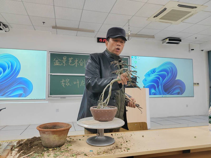 龙大师是盆景艺术领域的资深专家,深耕盆景艺术创作40余年,不仅拥有精湛的实操技艺,更对盆景艺术的文化内涵有着深刻阐释。授课伊始,叶龙大师结合自身创作经历,深入浅出地解读了盆景艺术“师法自然、天人合一”的核心理念,强调盆景创作不仅是技艺的展现,更是文化修养与审美情趣的融合,引导学生们从文化视角理解这一传统艺术瑰宝的独特价值。实操教学环节,叶龙大师现场选取典型盆景素材,手持工具逐一演示修剪、蟠扎、造型设计等关键技艺。从枝条的取舍原则、角度的调整技巧,到土壤配比、后期养护要点,大师都耐心细致地讲解每一个操作细节,“修剪要留有余地,既要遵循植物生长规律,又要兼顾艺术造型的层次感”,大师一边操作一边叮嘱,灵巧的双手让原本形态普通的盆景素材逐渐呈现出灵动的韵味,充分展现了盆景艺术“化腐朽为神奇”的魅力。在这堂别开生面的盆景课程中,不仅掌握了修剪的力度和造型的诀窍,更感受到了传统技艺中蕴含的工匠精神。