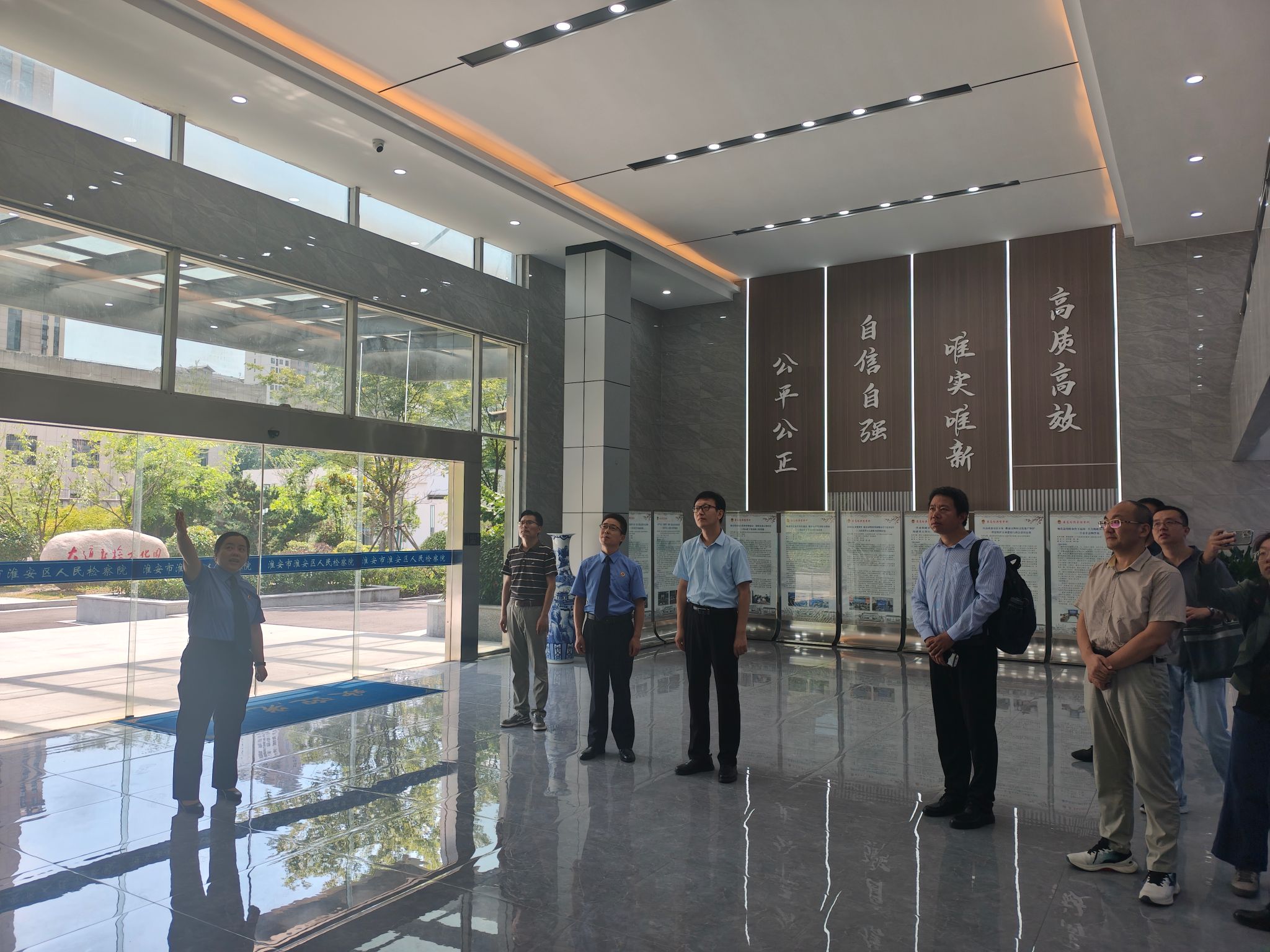 法学院一行参观考察了淮安区检察院,并与庞志毅等人进行了座谈交流。座谈会上,庞志毅对江苏大学法学院一行的到访表示诚挚的欢迎,他表示,检校合作前景广阔,双方可以充分发挥各自优势,在人才培养、理论研究、实践教学等方面开展全方位、深层次的合作。李炳烁介绍了江苏大学及江苏大学法学院基本情况,表示双方在理论课题研究、党建共建等方面有深远合作空间,双方一定能够实现资源共享、优势互补、合作共赢。