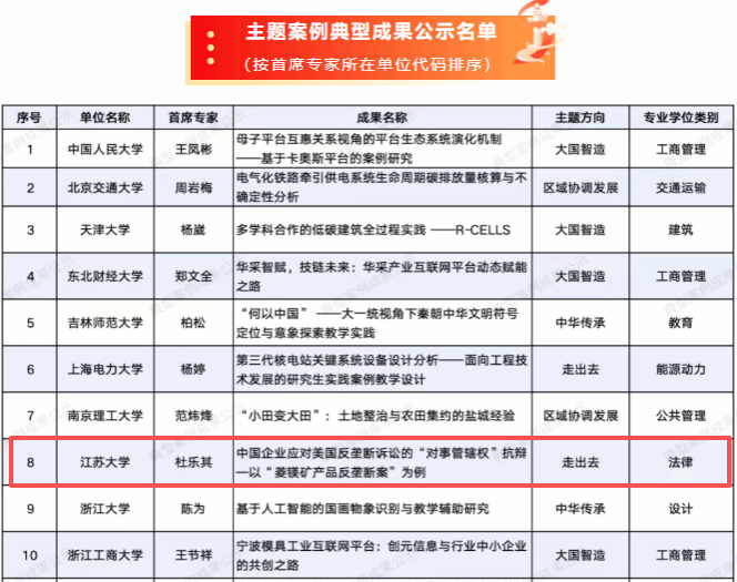 日前,教育部学位与研究生教育发展中心公布了2025年度主题案例典型成果,以支部党员杜乐其教授为首席专家的团队完成的案例“中国企业应对美国反垄断诉讼的‘对事管辖权’抗辩——以‘菱镁矿产品反垄断案’为例”成功入选。