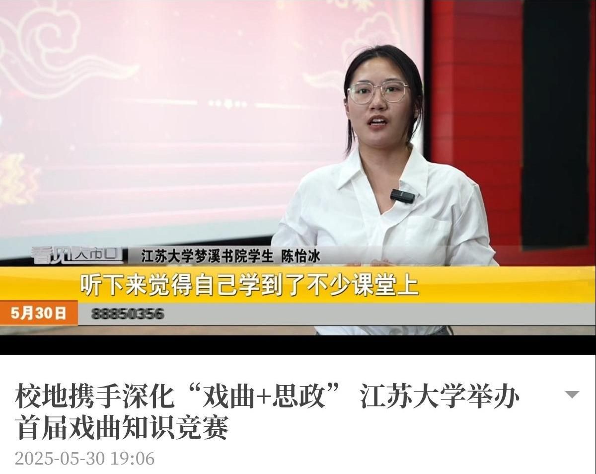 日前,江苏大学梦溪书院学生自治发展中心办公室负责人陈怡冰接受镇江电视台《看见大市口》栏目采访。她表示这次的戏曲知识竞赛形式非常新颖,既能学到课外的专业知识,又有助于提升审美情趣,增强文化自信。梦溪书院在校党委宣传部的支持指导下,于2024年5月与镇江市艺术创作研究中心共同发起成立中华优秀文化传承与传播实践基地,集戏曲创作、文艺讲坛、艺术培训、文艺演出等多种形式为一体的多功能文化志愿服务项目,旨在“繁荣传统文化,青年戏曲传承”。双方致力于推动文化育人力量和资源下沉一线,共同促进中华优秀传统文化在高校的传承创新,进一步增加文化自信,厚植爱国主义情怀。