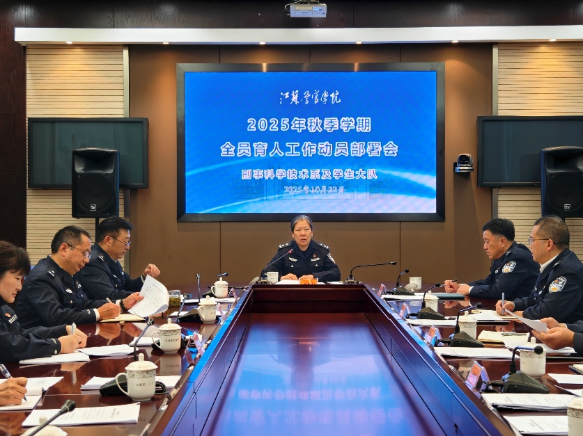 为落实立德树人、育警铸剑根本任务,全面提升人才培养质量,2025年10月22日,刑事科学技术系教师党员及学生大队召开2025年秋季学期全员育人工作动员部署会。院党委委员、副院长刘蔚文,院党委委员、教务处处长缪文升及高教研究中心、学生处、刑技系等相关负责人及教师党员代表参会。