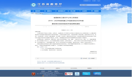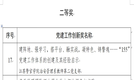 2021年6月17日,江苏省委教育工委发布《省委教育工委关于公布江苏高校2019—2020年度党建工作创新奖和2020年度最佳党日活动优胜奖评选结果的通知》(苏委教函〔2021〕16号),江苏警官学院治安管理系教师第二党支部“建阵地、强学习,搭平台、融实战,凝特色、铸警魂——‘155’党建工作体系的创建及其经验启示”荣获2019—2020年度江苏省高校党建工作创新奖二等奖。