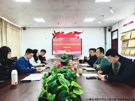 随后,双方在2414会议室进行座谈。张昊楠副书记介绍了天津电子信息职业技术学院及人工智能学院在基层党建、专业建设、师资培养与学生管理等方面的实践与思考,并重点分享了支部作为“双带头人”培育单位在推动党建与教学科研协同发展方面的探索。