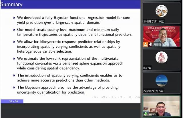 6月10日上午,加州大学河滨分校统计学教授李业华受统计与数据科学学院邀请在腾讯会议作题为“Bayesian Spatially Varying Coefficient Models with Functional Predictors”的学术报告。报告由统计与数据科学学院马海强老师主持,八十余名师生线上聆听了本次高端学术报告。