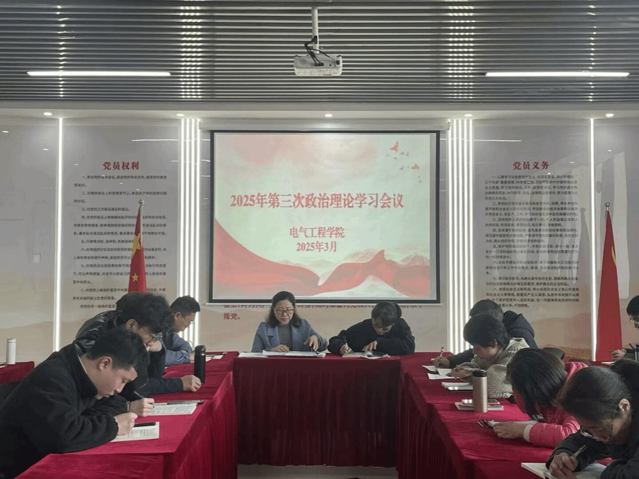 2025年3月19日,电气工程学院在学院会议室召开2025年第三次政治理论学习会议。本次会议以“深入学习贯彻习近平文化思想,深刻领悟‘两个结合’的理论飞跃”为主题,旨在将习近平文化思想深度融入高校育人实践,为学校高质量发展筑牢思想根基与精神支撑。