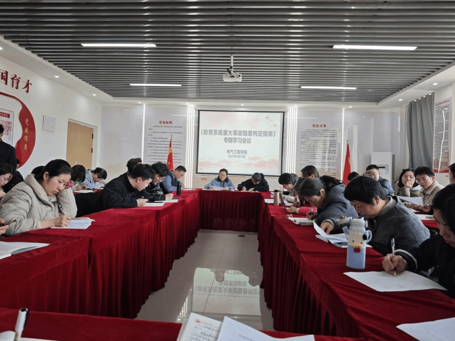 3月18日下午,电气工程学院在学院会议室召开了一场重要的专题学习会议,主题为《教育系统重大事故隐患判定指南》。学院党总支书记万春琳、院长刘曼、副院长殷欢、党总支副书记曾昊以及学院全体教职工参加了此次学习会议。