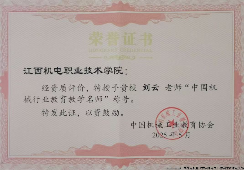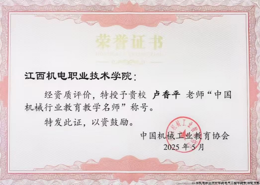 会议颁发了中国机械行业教育教学名师证书,学院国家级教师创新团队成员、电气自动化教研室主任卢香平,电气实训室教师刘云均荣获“中国机械行业教育教学名师”称号。