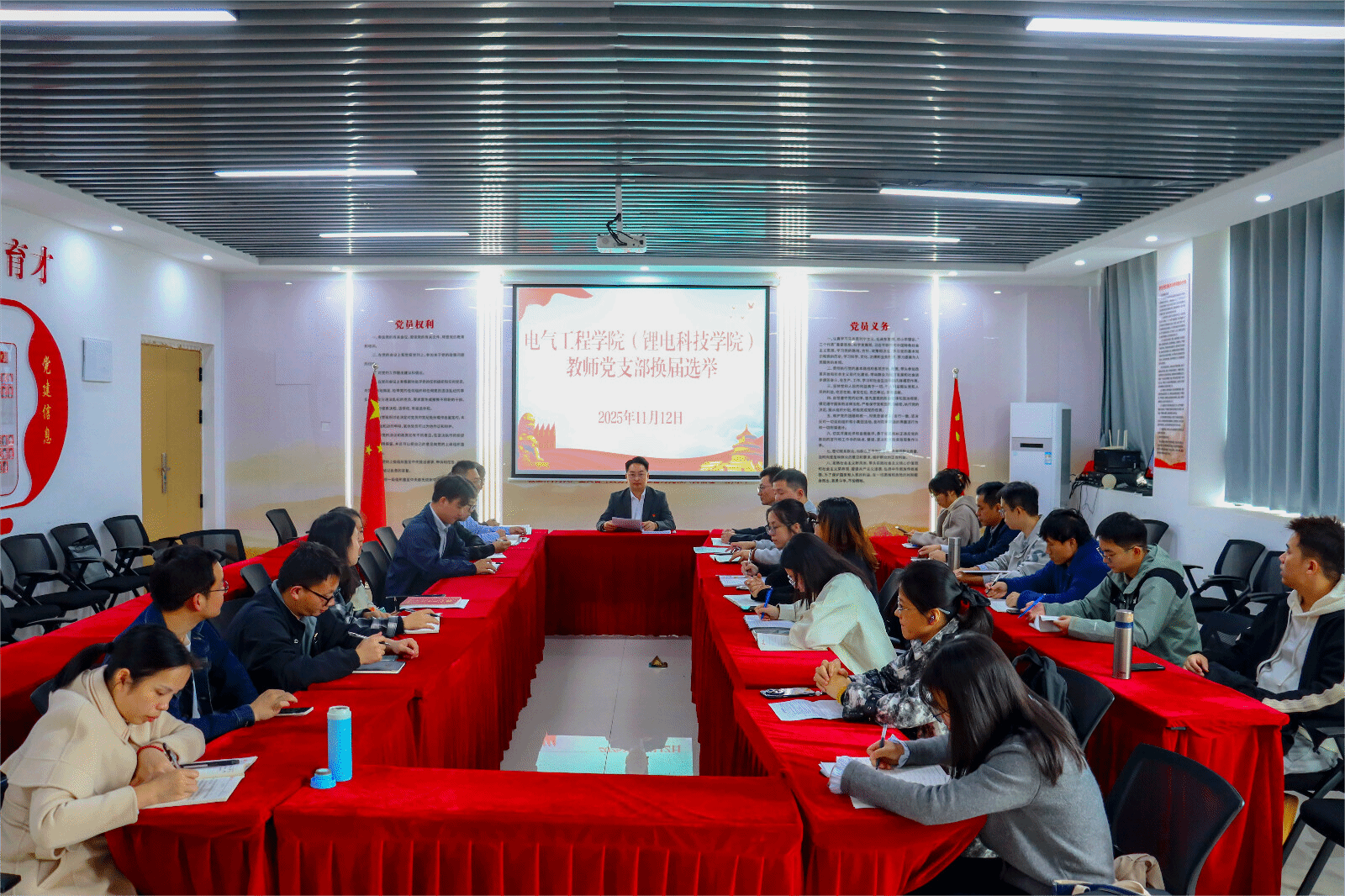 2025年11月12日,电气工程学院(锂电科技学院)教师党支部召开党员大会,顺利完成支部换届选举工作。此次会议旨在进一步加强基层党组织建设,选优配强支部领导班子,为学院高质量发展提供坚实的组织保障。会议由教师党支部书记王定友主持,学院党总支负责人高武到会指导。
