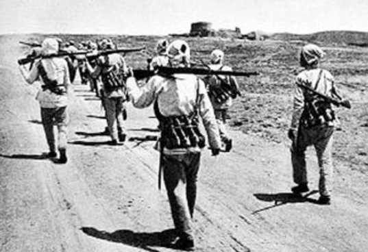 △抗日战争时期冀中地区敌后武工队追击伪军,收缴伪军逃跑中丢弃的自行车和武器。